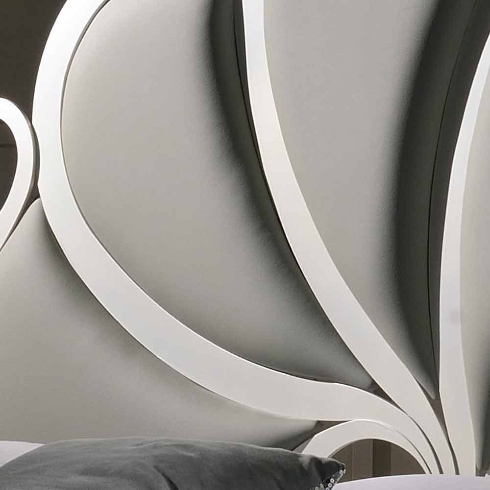 This bed is handmade in Italy by expert crafstmen and it has a pearl finish. The headboard is padded and covered in grey faux leather and it is embellished by crystal decorations.