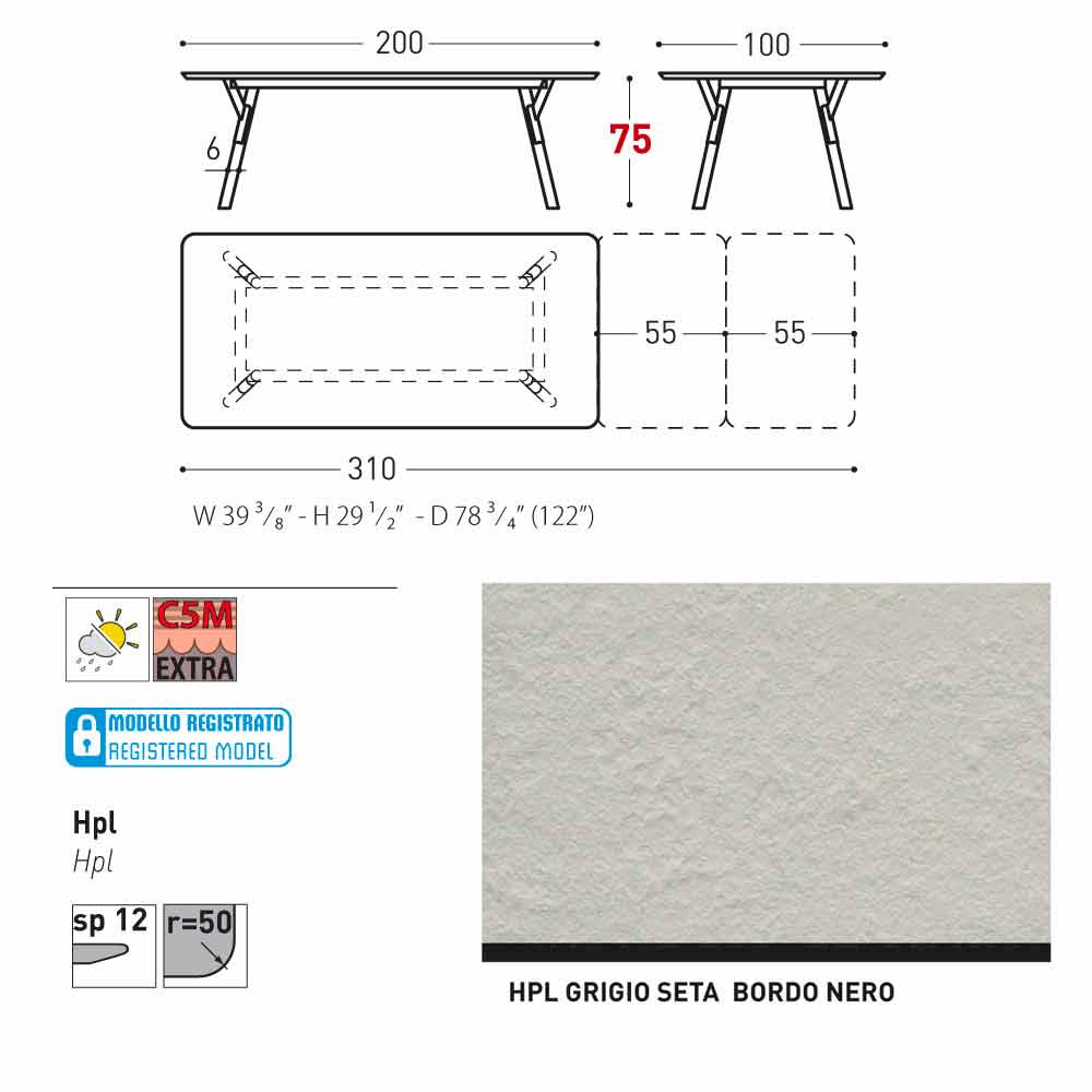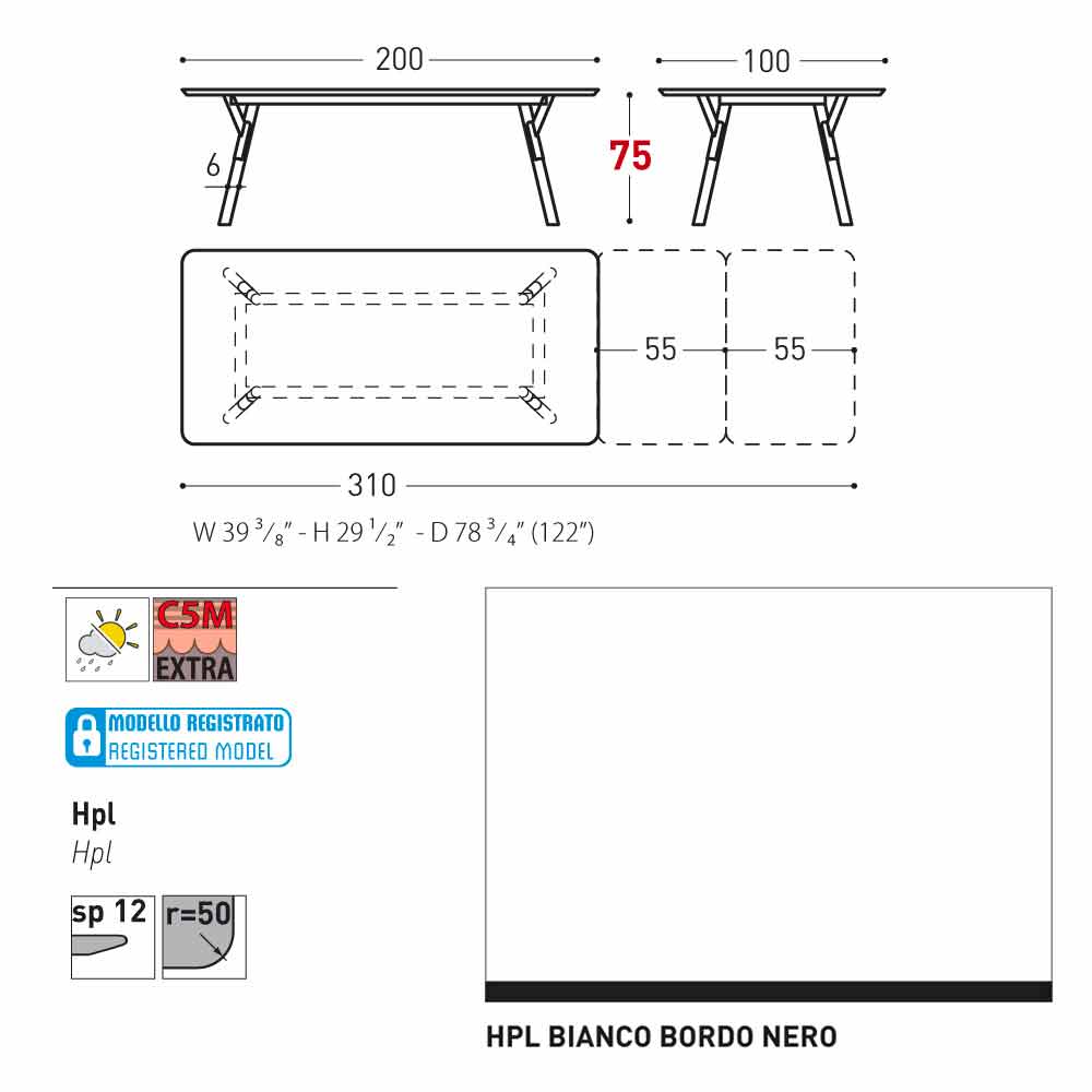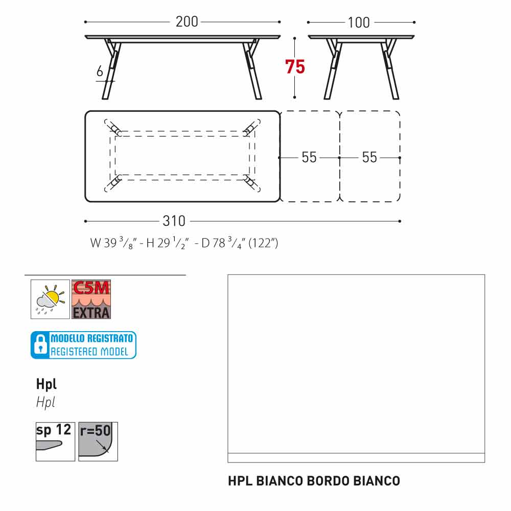 100x200/310xH75 cm - 2 extension leaves 55 cm ciascuna