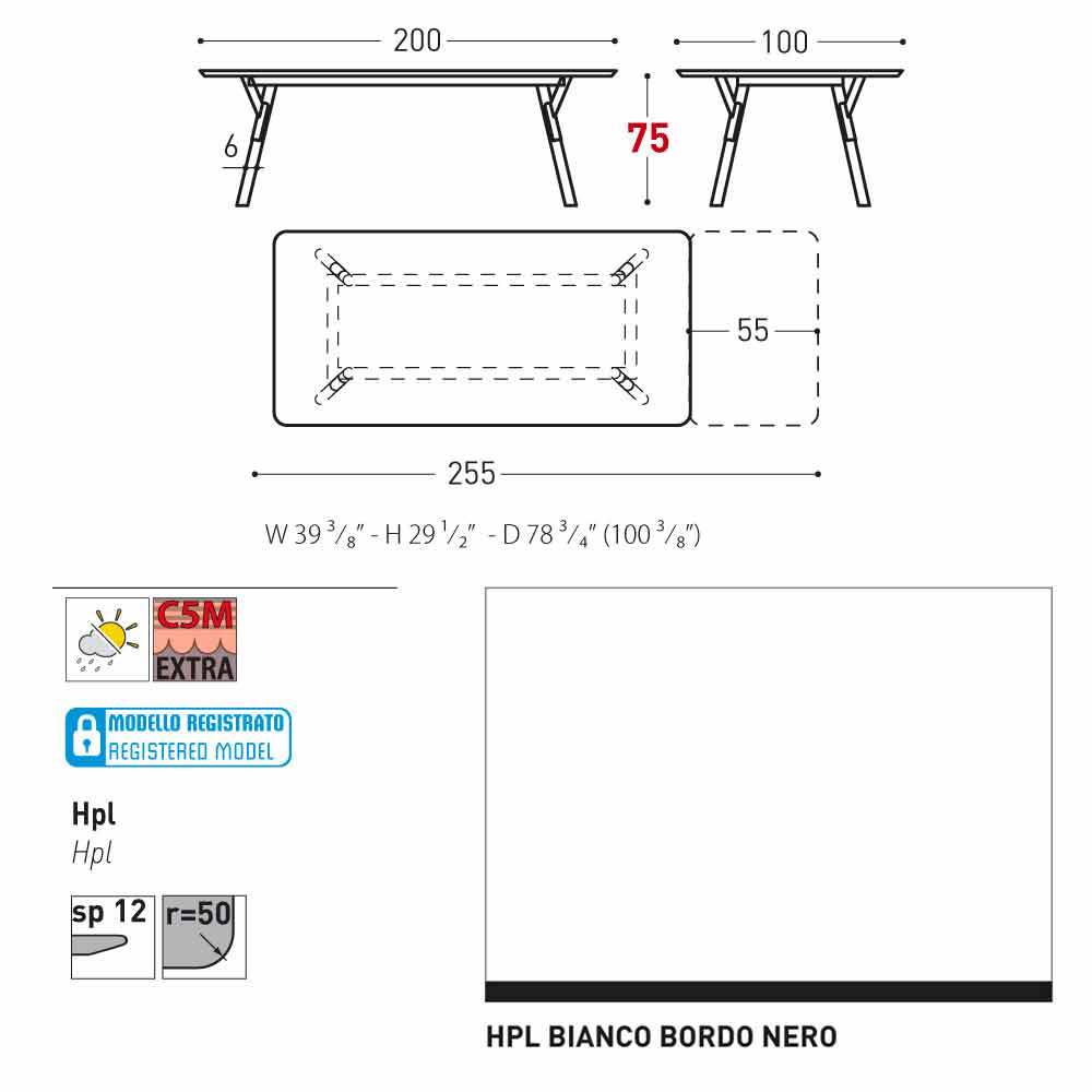 HPL technical features : High-pressure laminates. They are made of several layers of paper (70%) impregnated with thermosetting resins (30%) and compacted for about 45-50 minutes through the combined action of heat ( at about 150 degrees) and high pressure (greater than 7 MPa / Megapascal per square meter.) The result is a stable, nonreactive, non-porous and high-density product. It has physical and chemical features of high mechanical strength (controlled temperature excursion +80/-40 degrees, for less than 30 seconds at extreme temperatures). It resists to light exposure and temperature variations, even in marine environments.