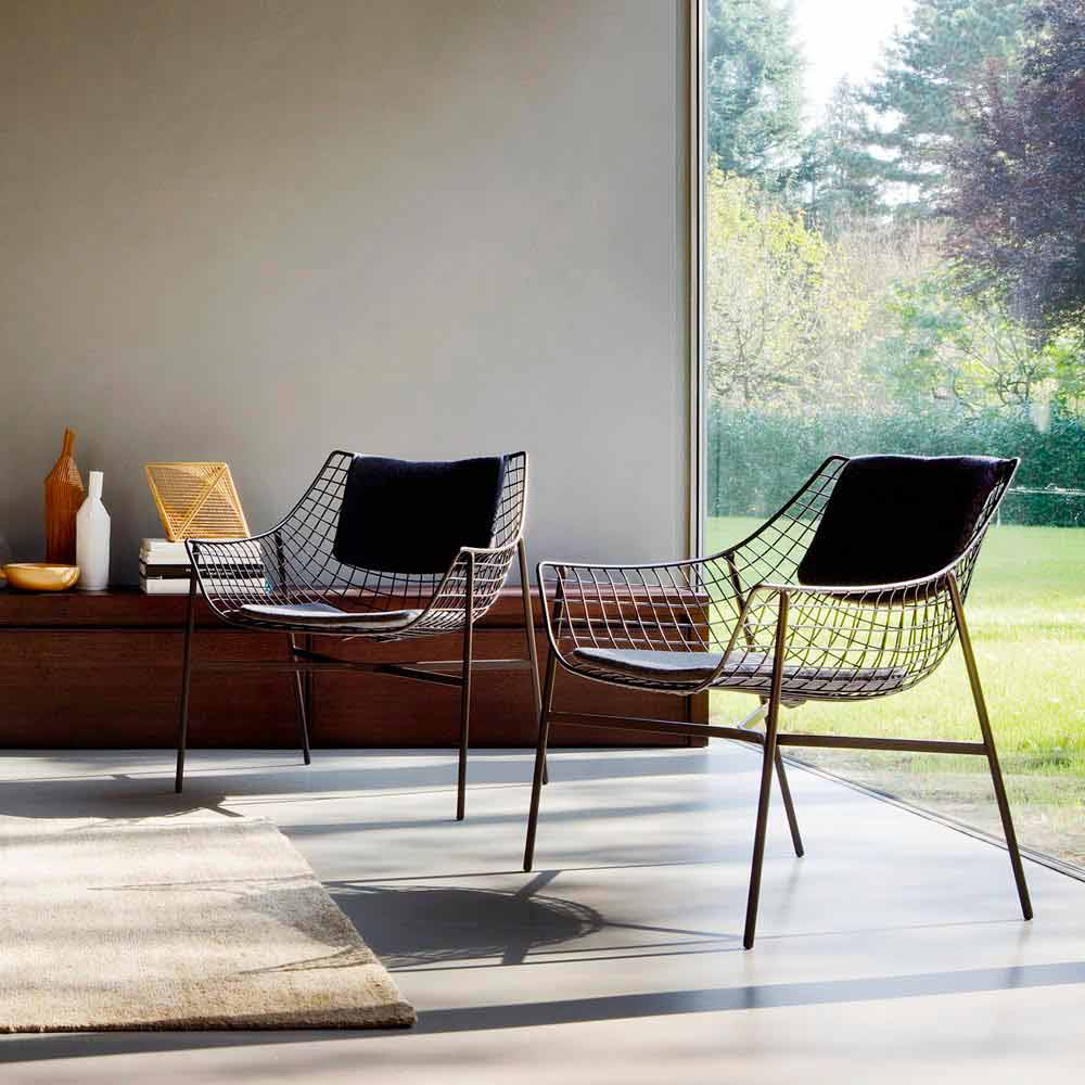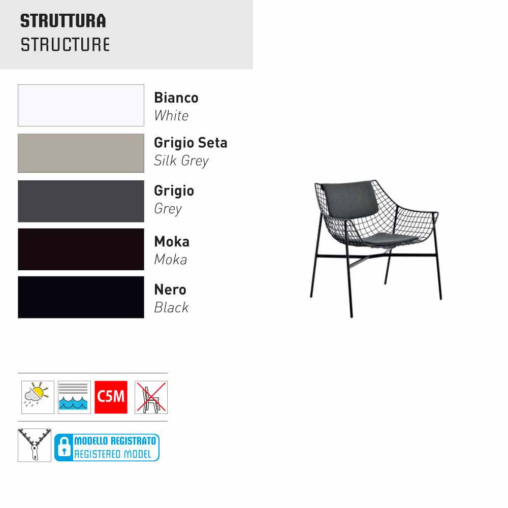 The garden armchair Summes Set has a powder coated steel fame and it is a registered model. Thanks to its versatile design, you can use it both outdoor or indoor. It comes with seat and backrest cushions.