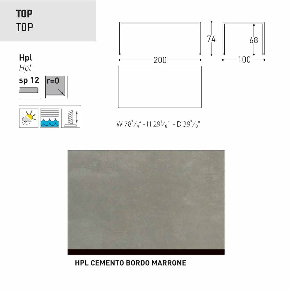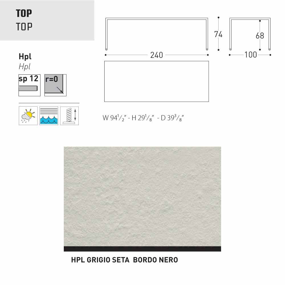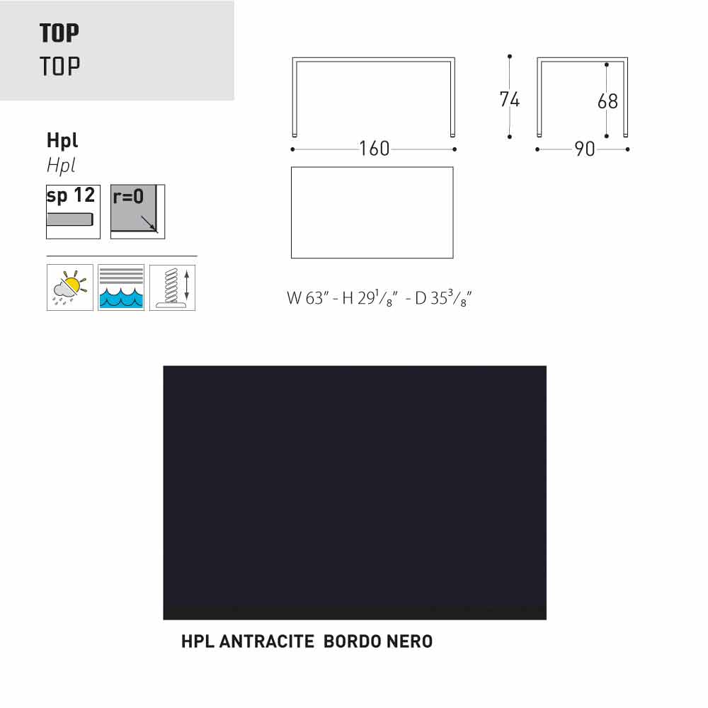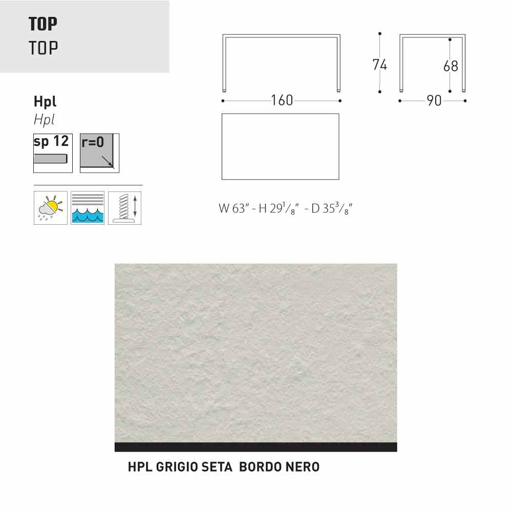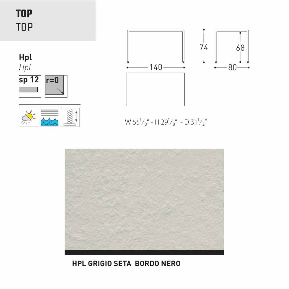 HPL technical features : High-pressure laminates. They are made of several layers of paper (70%) impregnated with thermosetting resins (30%) and compacted for about 45-50 minutes through the combined action of heat ( at about 150 degrees) and high pressure (greater than 7 MPa / Megapascal per square meter.) The result is a stable, nonreactive, non-porous and high-density product. It has physical and chemical features of high mechanical strength (controlled temperature excursion +80/-40 degrees, for less than 30 seconds at extreme temperatures). It resists to light exposure and temperature variations, even in marine environments.