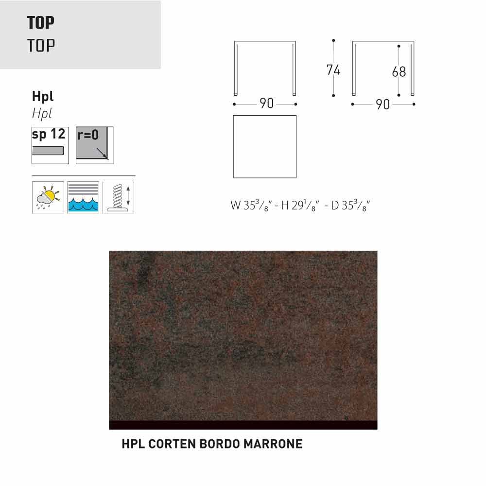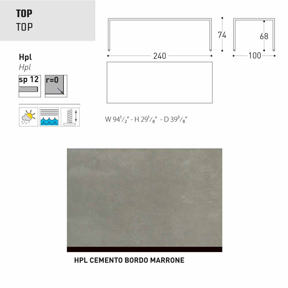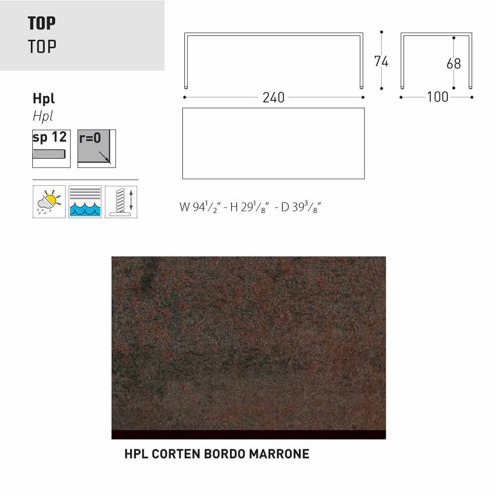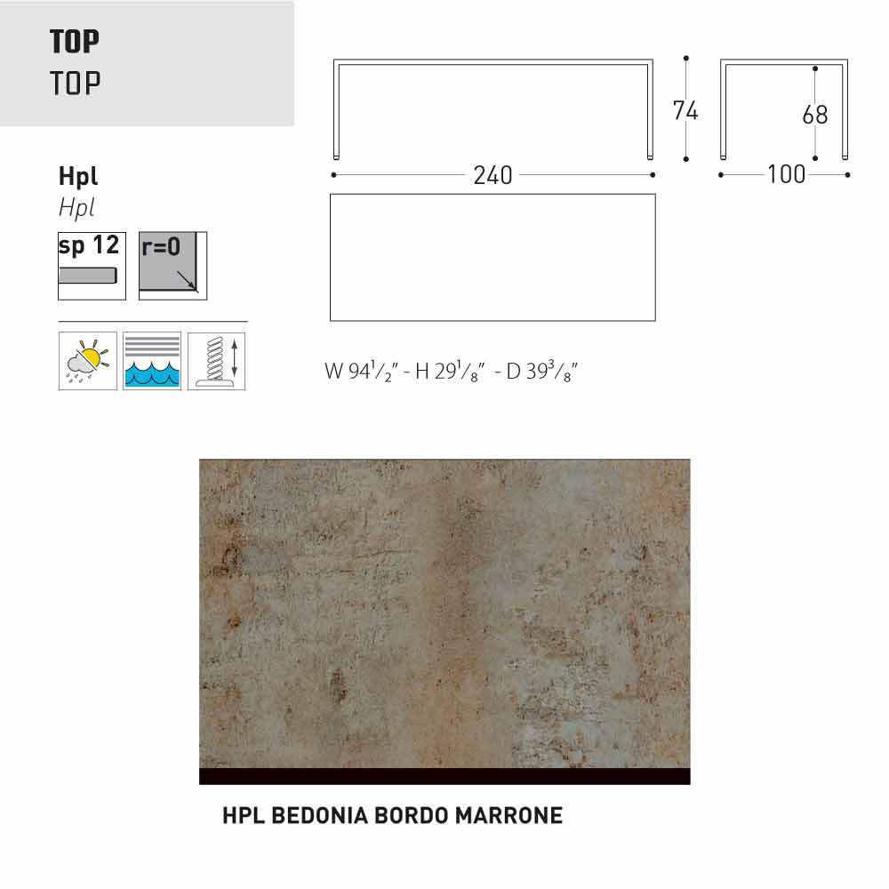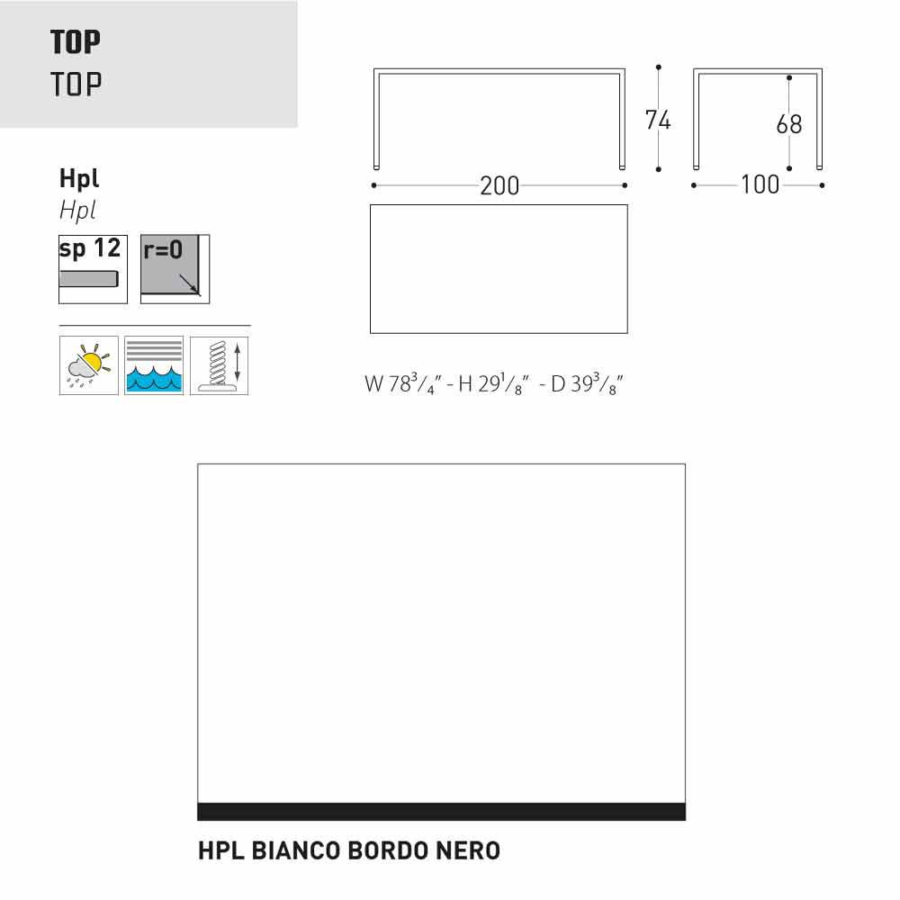 HPL technical features : High-pressure laminates. They are made of several layers of paper (70%) impregnated with thermosetting resins (30%) and compacted for about 45-50 minutes through the combined action of heat ( at about 150 degrees) and high pressure (greater than 7 MPa / Megapascal per square meter.) The result is a stable, nonreactive, non-porous and high-density product. It has physical and chemical features of high mechanical strength (controlled temperature excursion +80/-40 degrees, for less than 30 seconds at extreme temperatures). It resists to light exposure and temperature variations, even in marine environments.