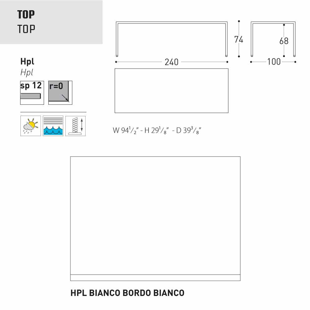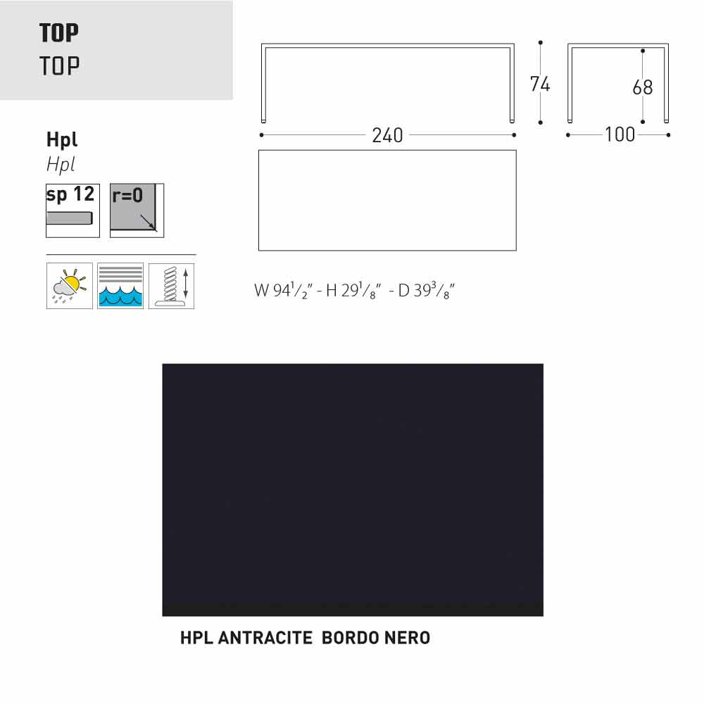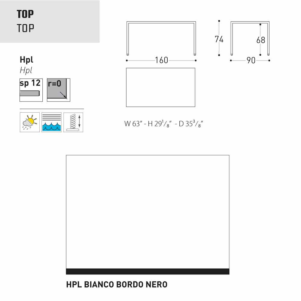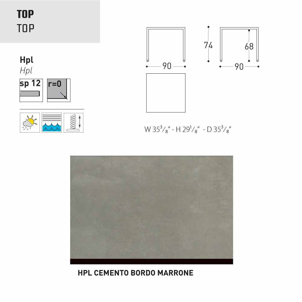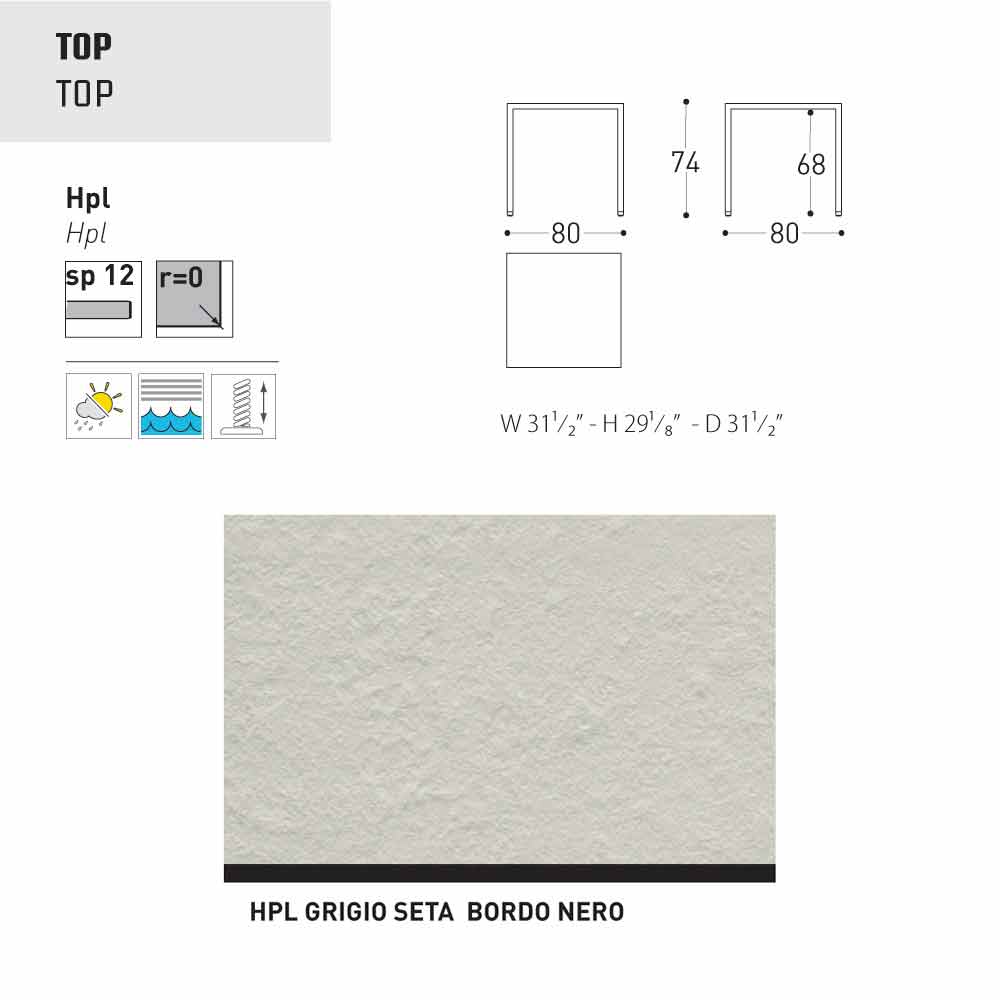 HPL technical features : High-pressure laminates. They are made of several layers of paper (70%) impregnated with thermosetting resins (30%) and compacted for about 45-50 minutes through the combined action of heat ( at about 150 degrees) and high pressure (greater than 7 MPa / Megapascal per square meter.) The result is a stable, nonreactive, non-porous and high-density product. It has physical and chemical features of high mechanical strength (controlled temperature excursion +80/-40 degrees, for less than 30 seconds at extreme temperatures). It resists to light exposure and temperature variations, even in marine environments.