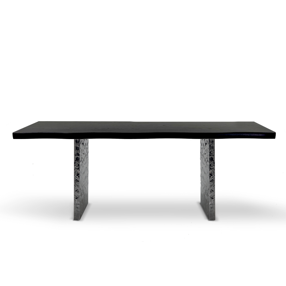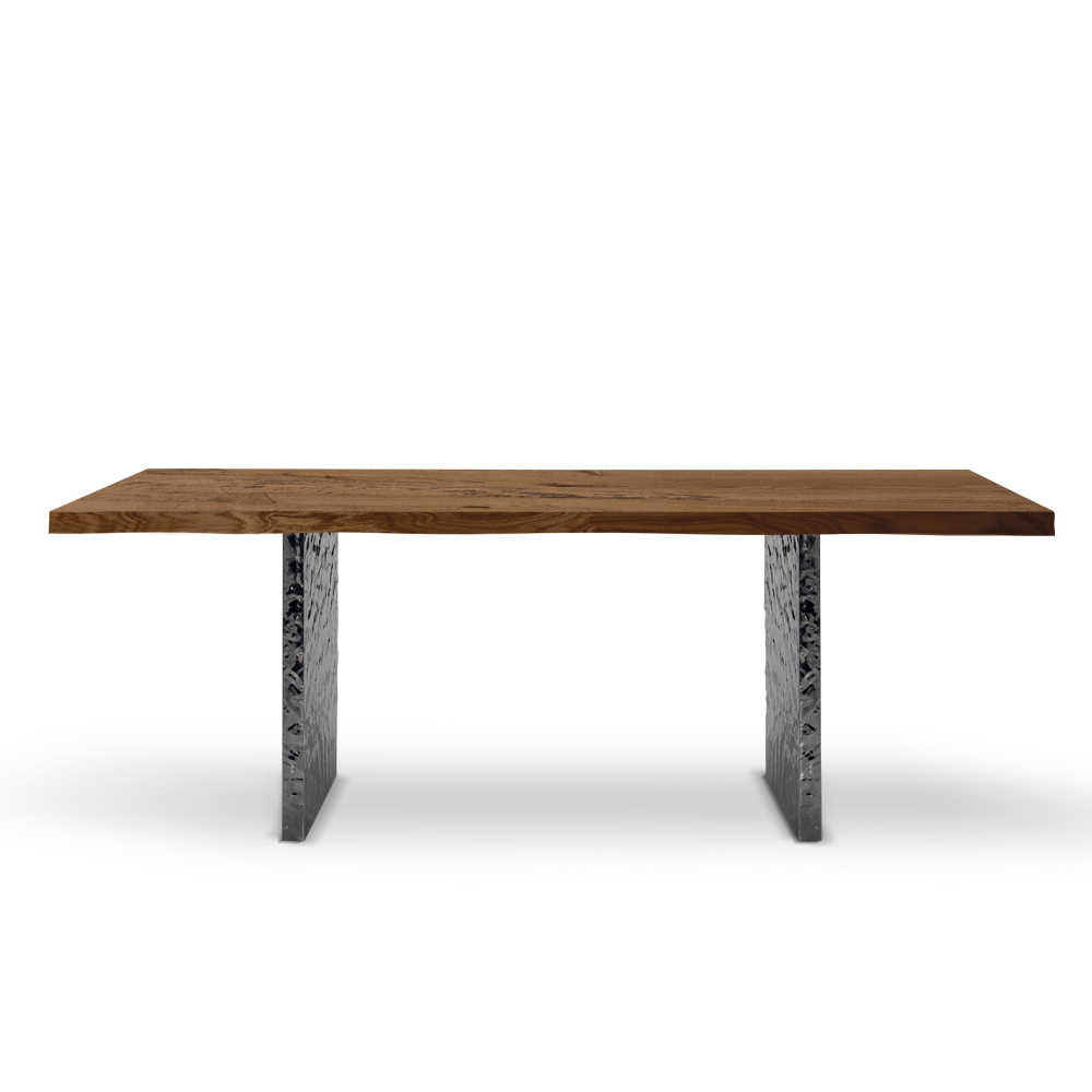 Design table with veneered wood top and hammered steel base handcrafted in Italy.