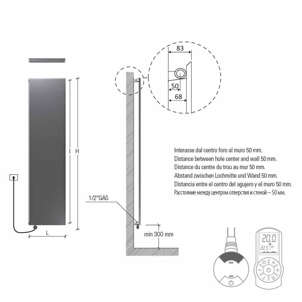 The 110 mm thermostat must be added to the height. White thermostatic box as standard for white radiators; chrome for the colored radiators and stainless steel finishes. Single-phase 230 volt power supply.