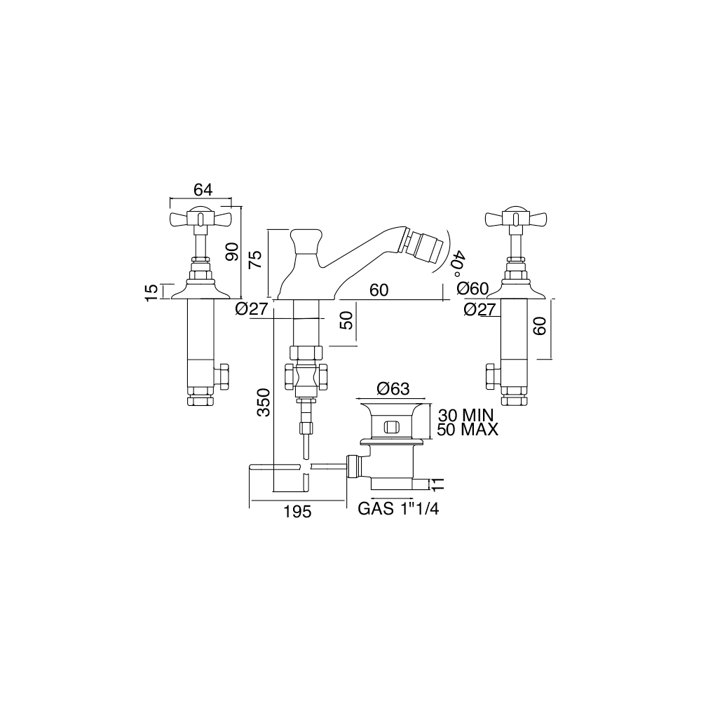 Vintage style 3-hole bidet mixer in brass Katerina, made in Italy.