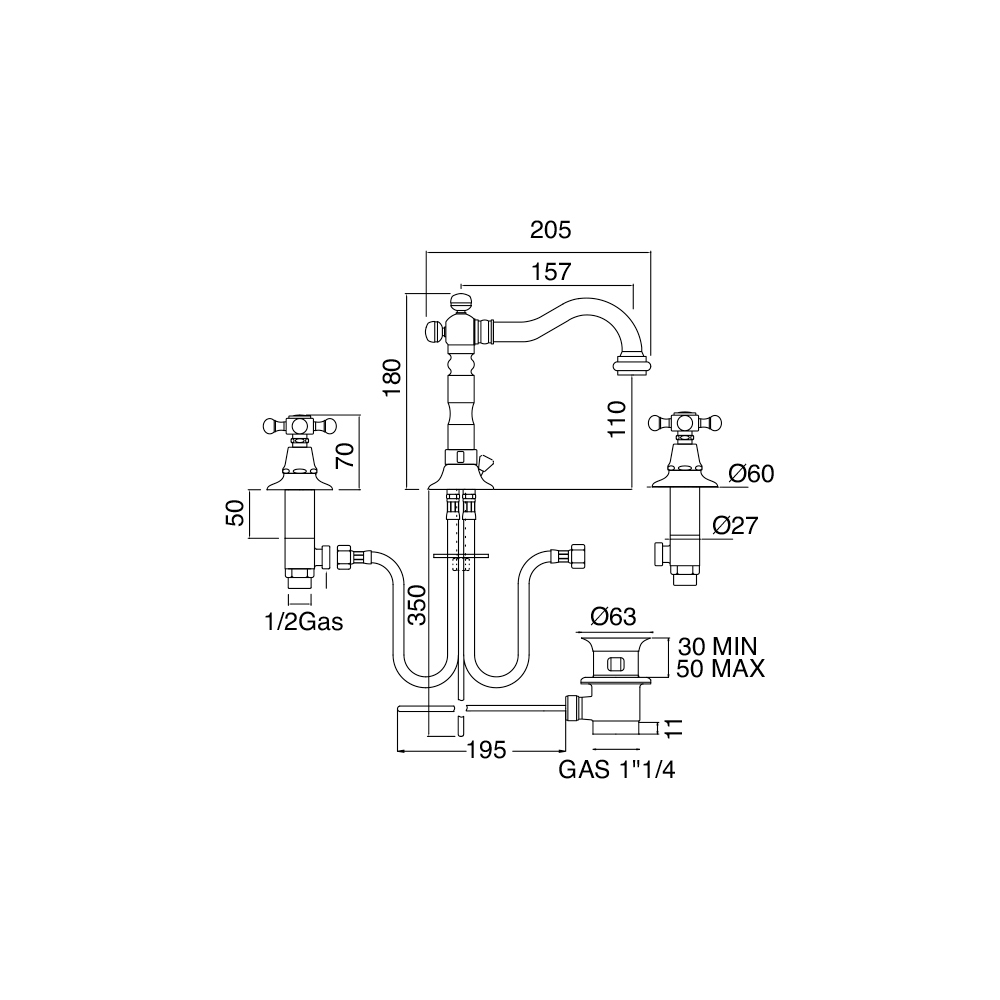 3-hole basin mixer with drain, made of brass.