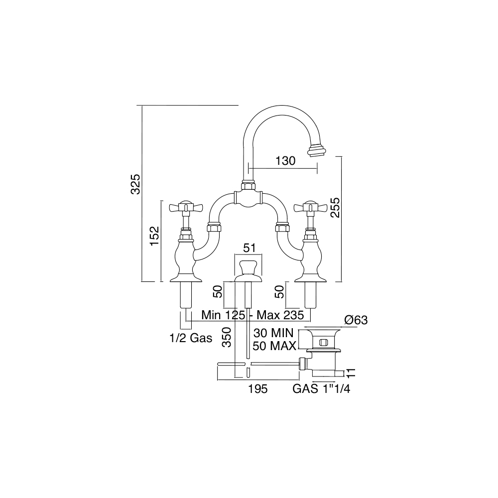 bridge unit for 2-3 hole washbasin with drain, adjustable center distance and jointed spout.