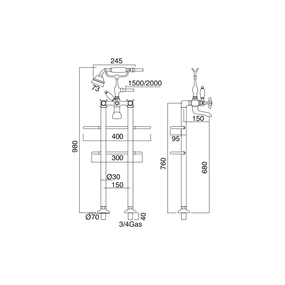 floor-standing bathtub set Ā with towel rail, hand shower and hose.