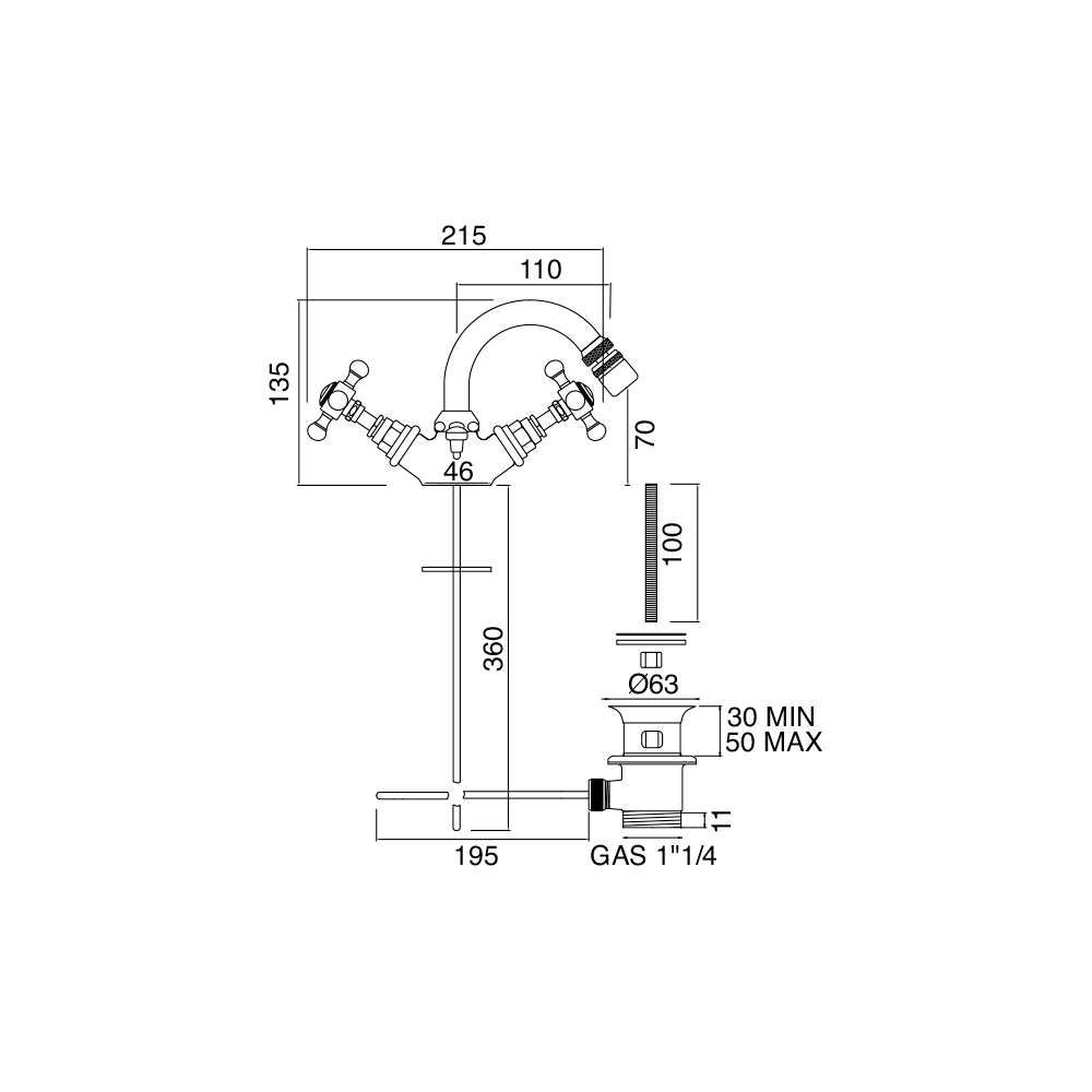 single hole bidet mixer Ā with drain, made of brass.