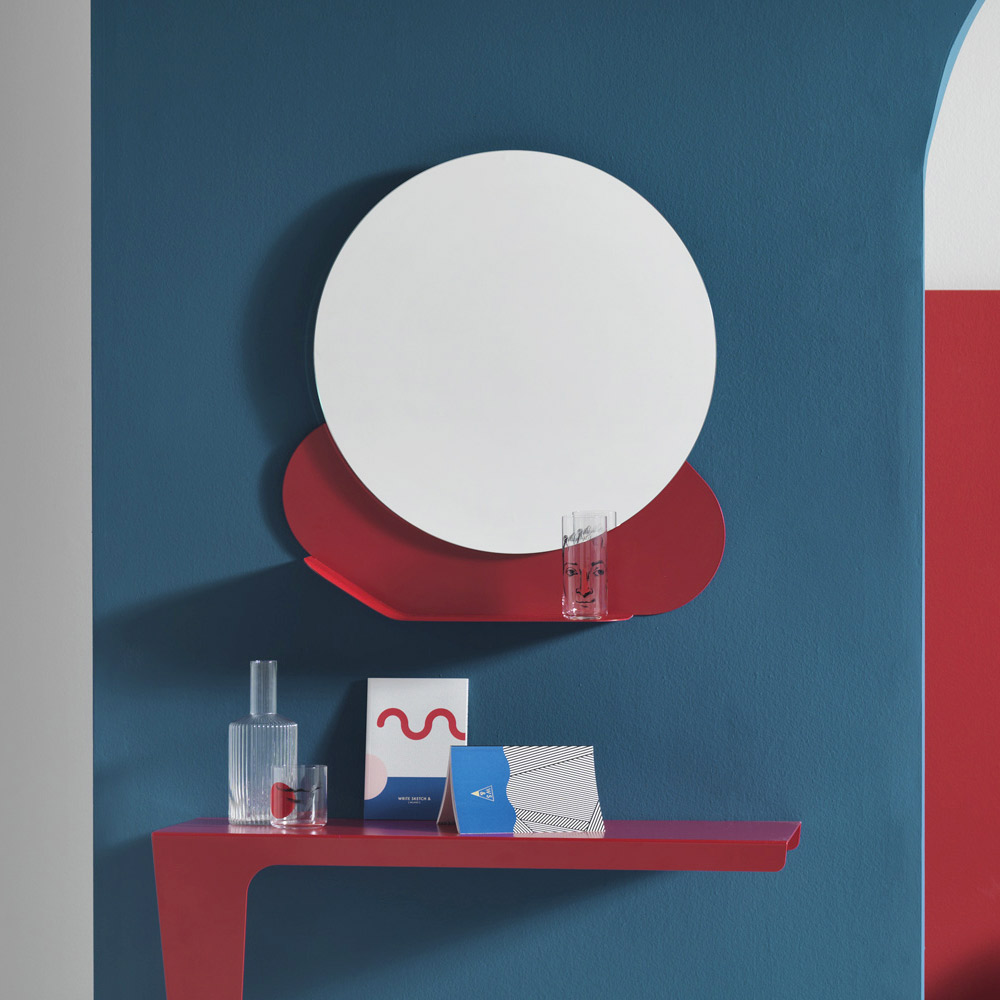 This modern design wall mirror fits into young contexts thanks to the lower shelf in colored metal with lively and contemporary colors, which delimits the round shapes of the mirror and creates continuity with the surrounding environment. A practical and functional product with an original and sparkling design able to characterize different contexts, from the entrance to the living room as well as in the bathroom or bedroom.