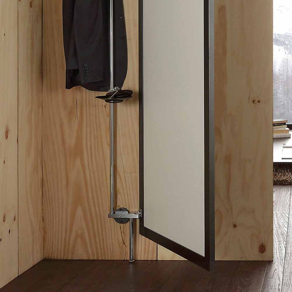 Innovative wall mirror in smoked glass with opening made in Italy with black painted metal frame complete with chromed metal wall system including 3 coat hooks and a practical storage plate. An extremely simple and essential design is combined with an original and innovative idea, thus giving life to a functional furnishing solution capable of adapting to any environment within which it creates a hidden space to be dedicated to the organization of various objects. Its structure is designed for the corner spaces of the house that are often not used but which can be transformed into practical areas in which to place bags, coats and more, managing to maintain a clean and tidy environment.