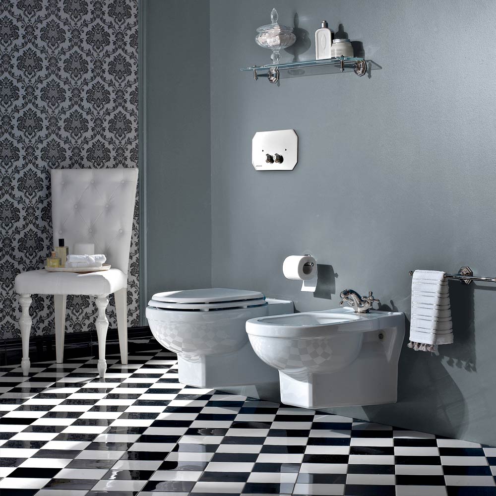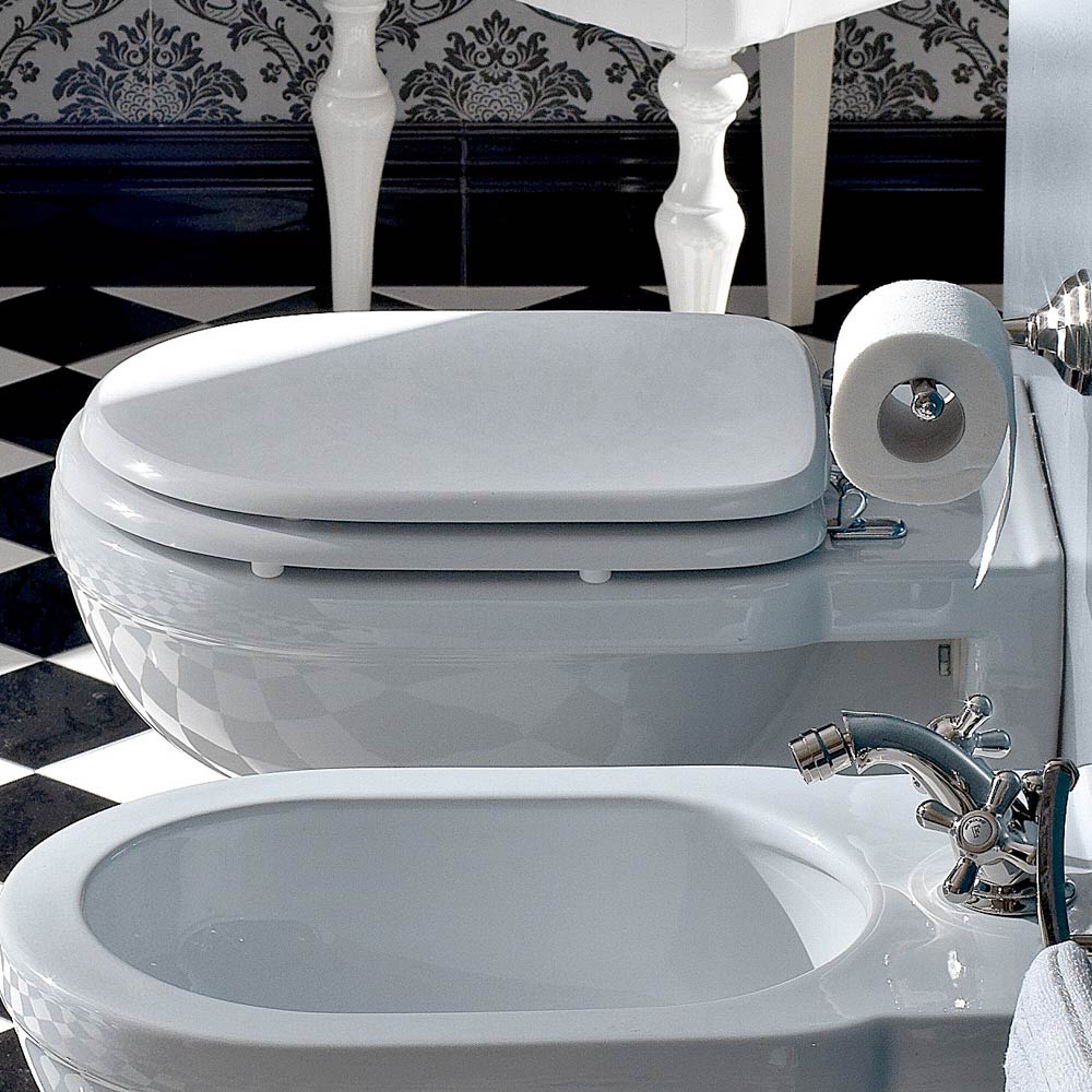 Marwa Ā is an innovative wc vesselsuspended with a dripping rim, handmade in Italy in white ceramic and whiteseat with chrome hinges . Thanks to its small details and the revised classic design it will be perfect to be the protagonist of your bathroom.