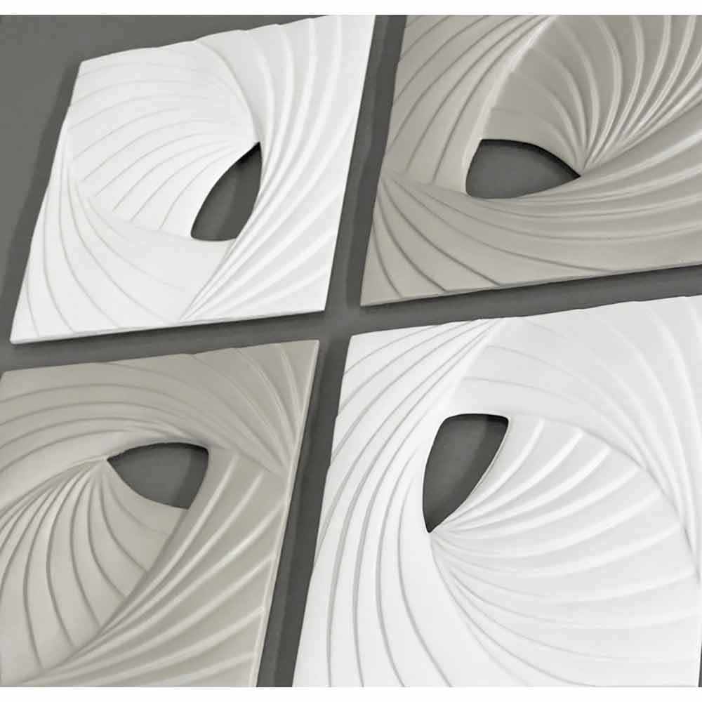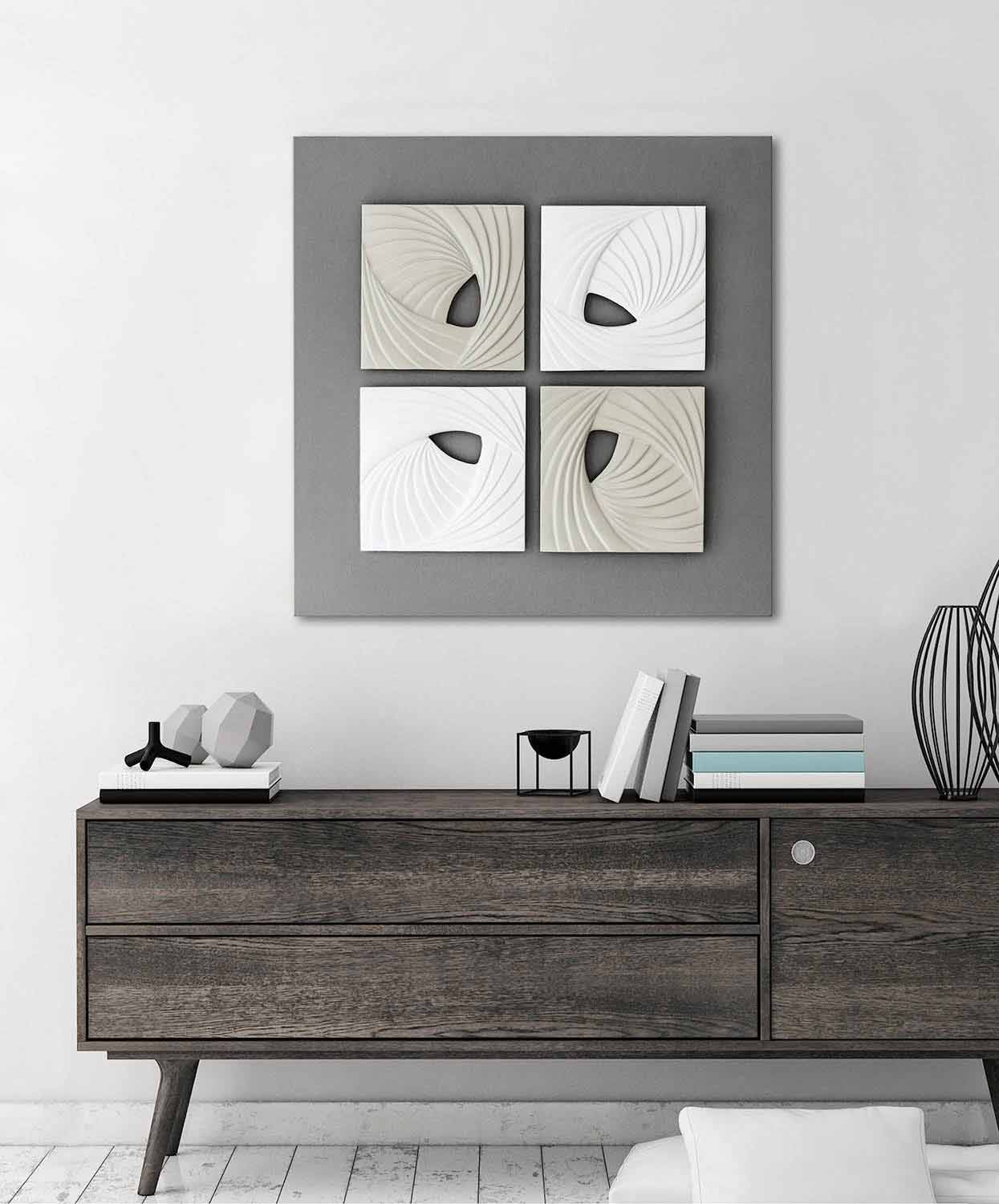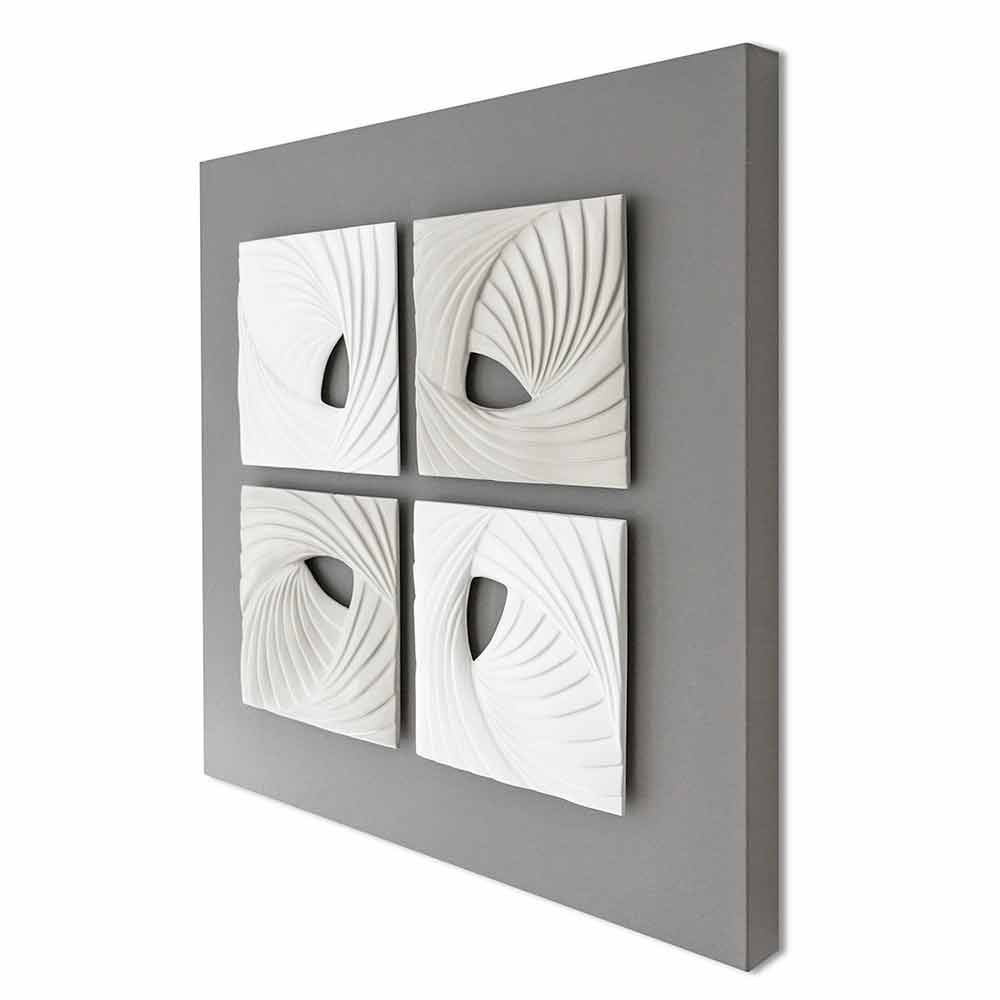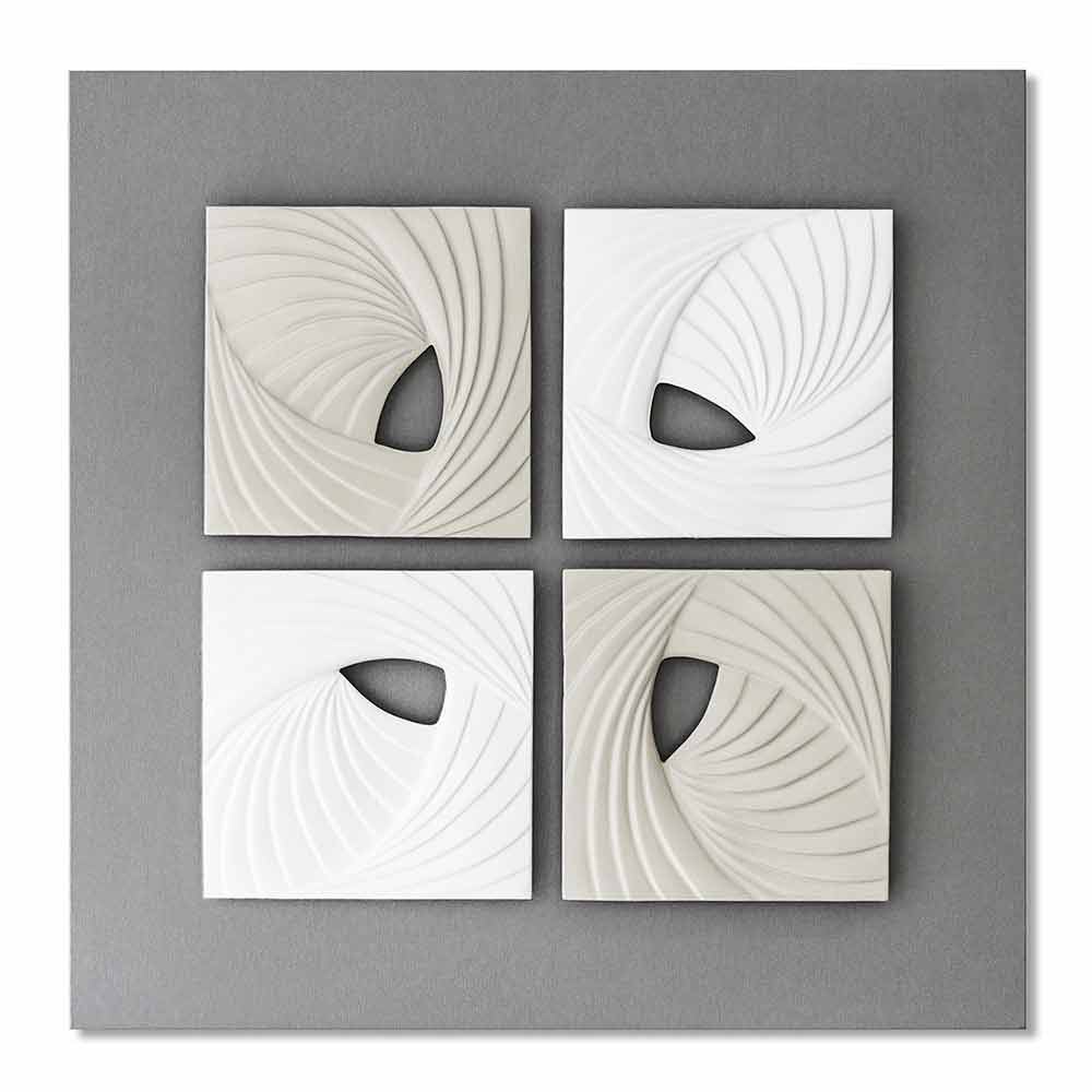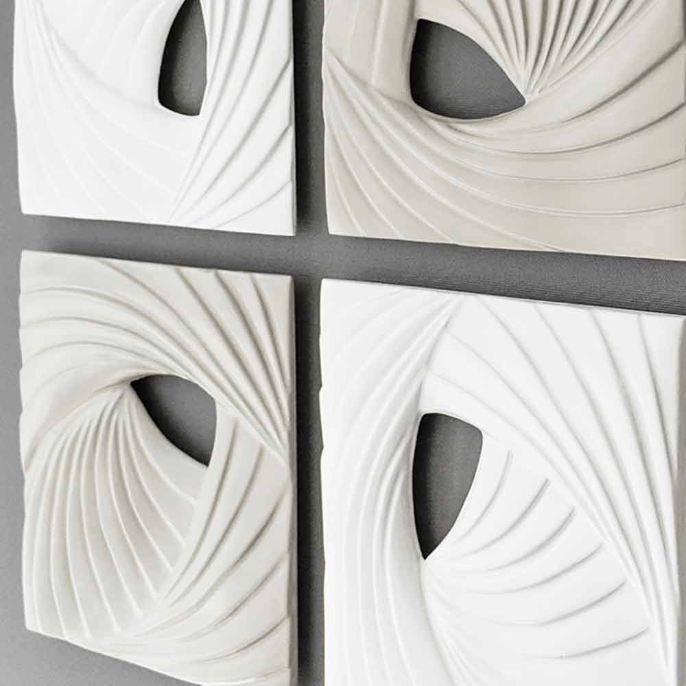 This hand-decorated bas-relief wallinstallation incomposite ceramic is composed of four elements with elegant lines and modern shapes in ivory white and silk gray mounted overhanging on stone gray lacquered canvas. The result is with a minimal and decorative aesthetic impact, for a unique style.