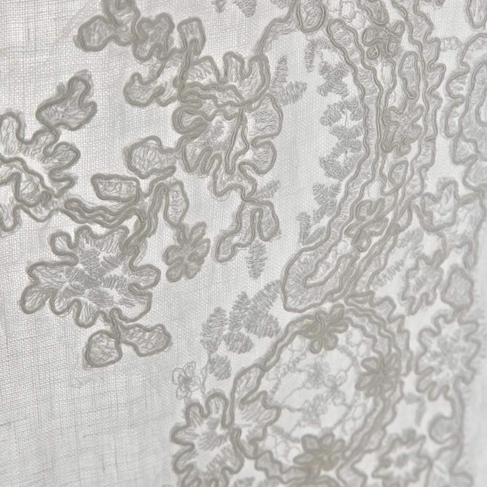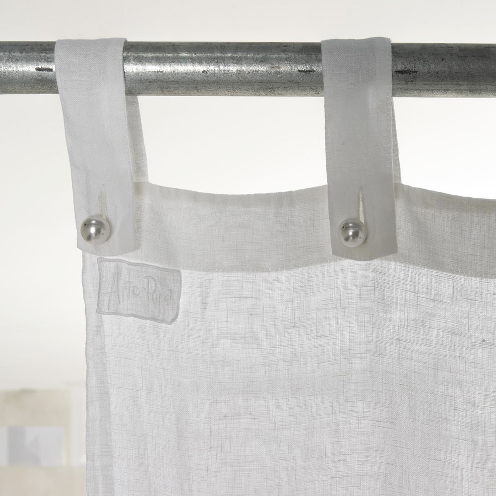white light linen curtain with central lace of elegant decoration and lacing with Agoya mother-of-pearl buttons.