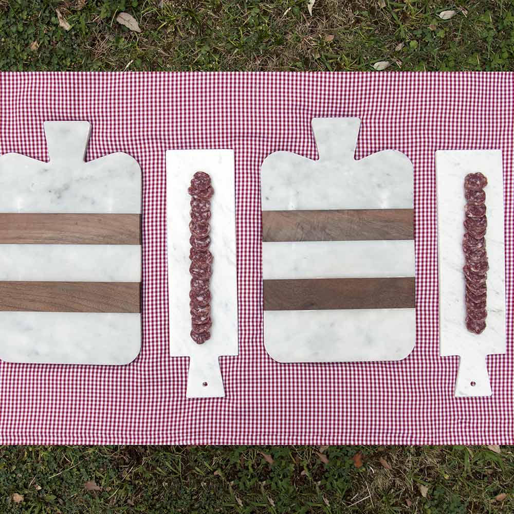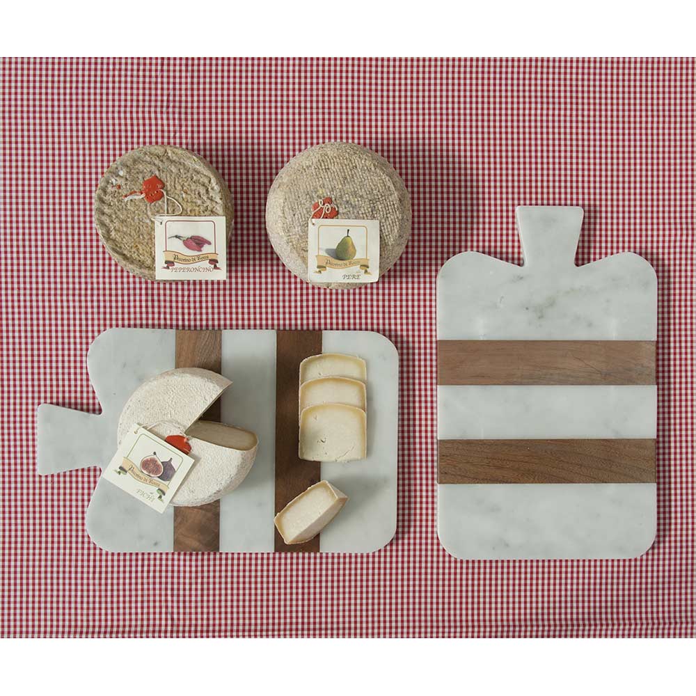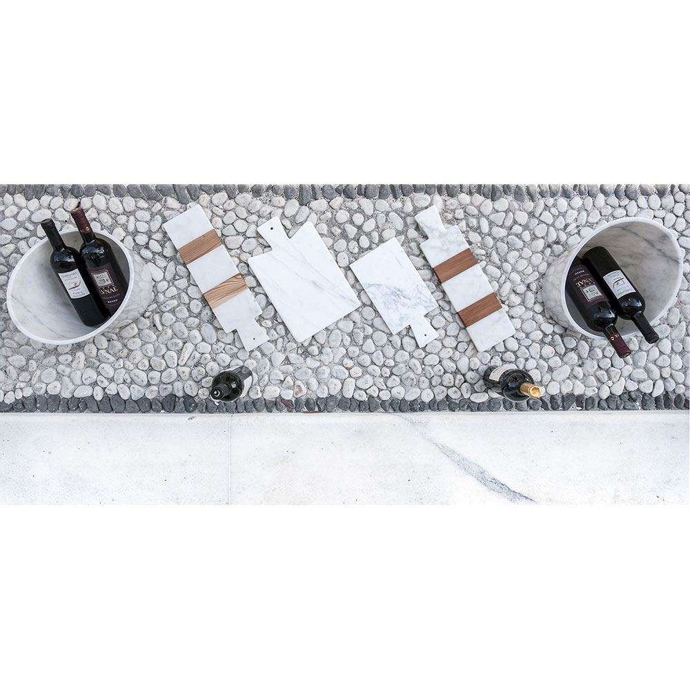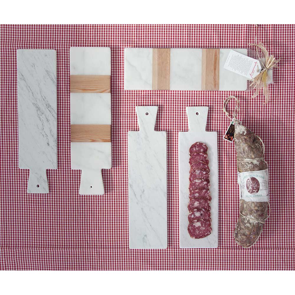 Rectangular cutting board available in 2 sizes characterized by high quality white Carrara marbleused for its realization and by the wooden inserts . It also includes a practical hole on the handle for hanging. It is a uniquepiece as each block of marble is different in veins and shades. Born from the hands of Italian artisans specialized for generations in marble processing and for this reason any variation in shape and color is to be considered as a guarantee of craftsmanship. The marble used for the realization of the product comes from the Poggio Silvestre quarry which is a source of first quality white marble classified since the last century.