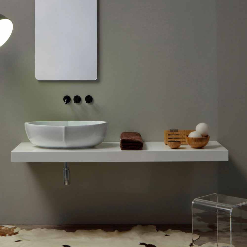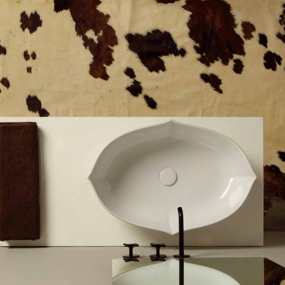 Countertop design washbasin in white ceramic made in Italy Oscar Washbasin with generous dimensions, offers an aesthetic impact of absolute effectiveness. On it are applicable all the decorations that you want starting from the choice of the drain according to our pleasure getting a really refined result.