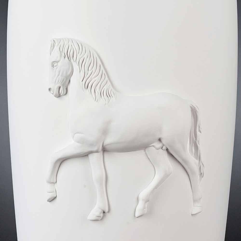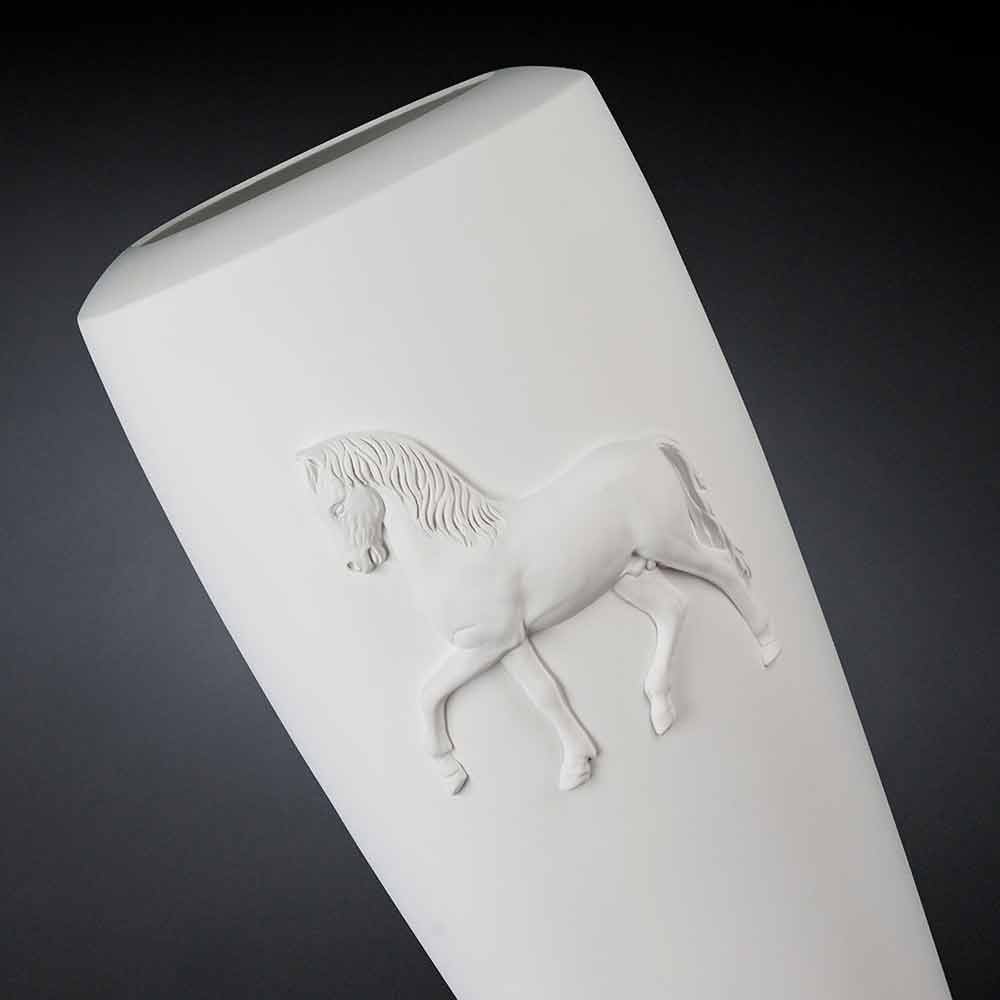 Decorative ceramic vase handmade by Italian artisans, characterised by a modern design. A horse is embossed on the surface.