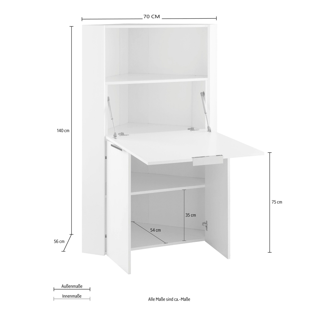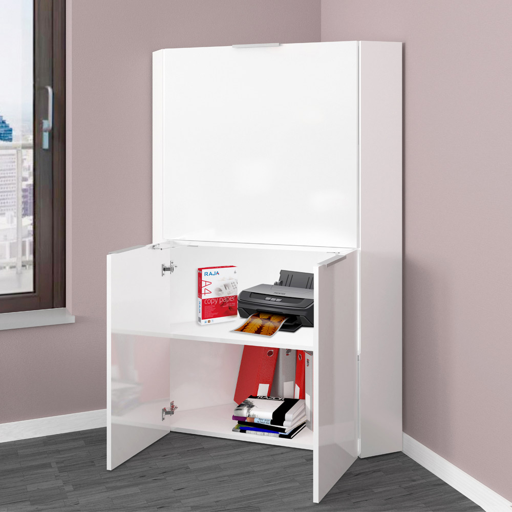 The wall-mounted desk is characterized by its minimal and space-saving corner design that can be placed in the office or bedroom. The structure consists of two lower hinged doors and an upper flap door which also acts as a desk top when opened downwards through the practical use of a handle.