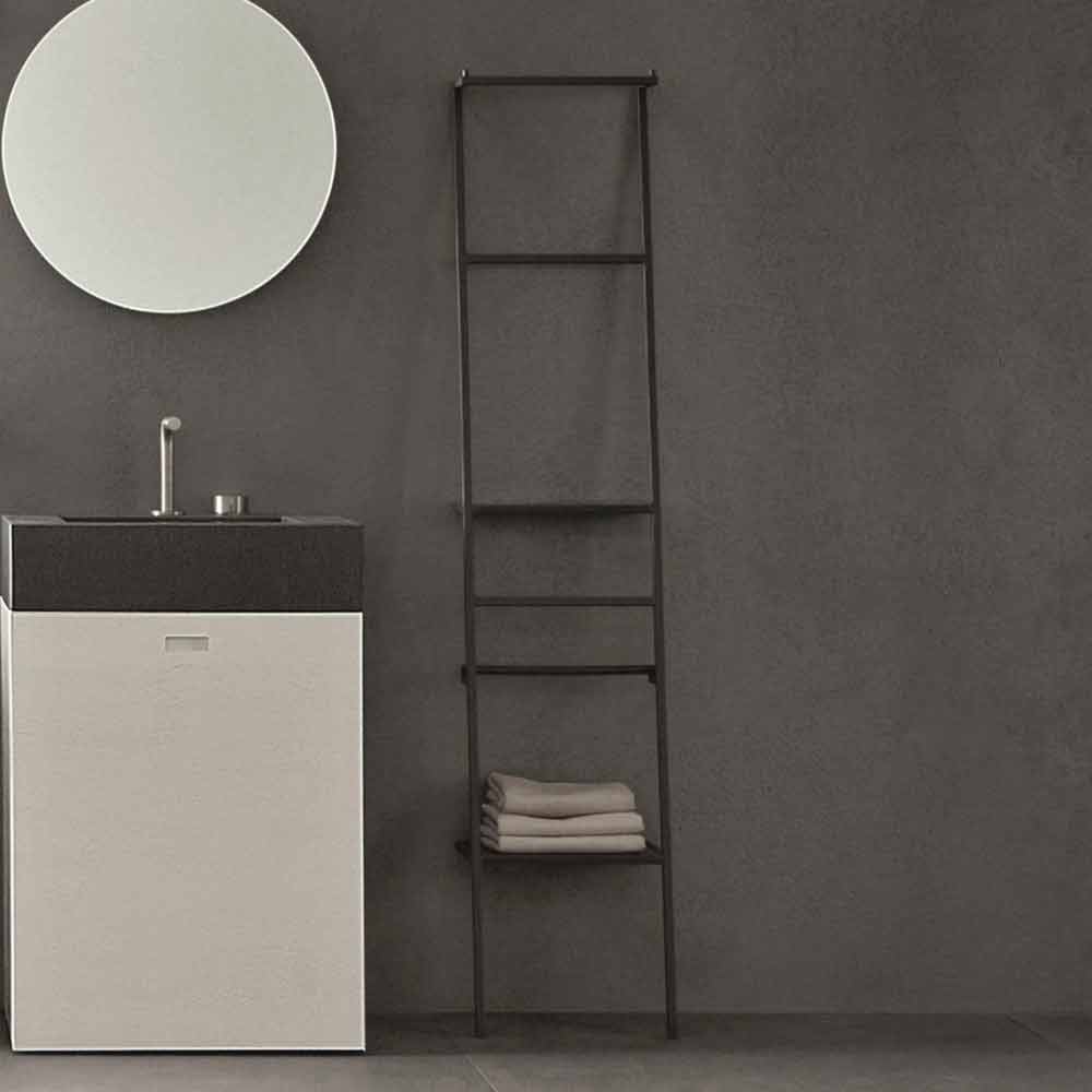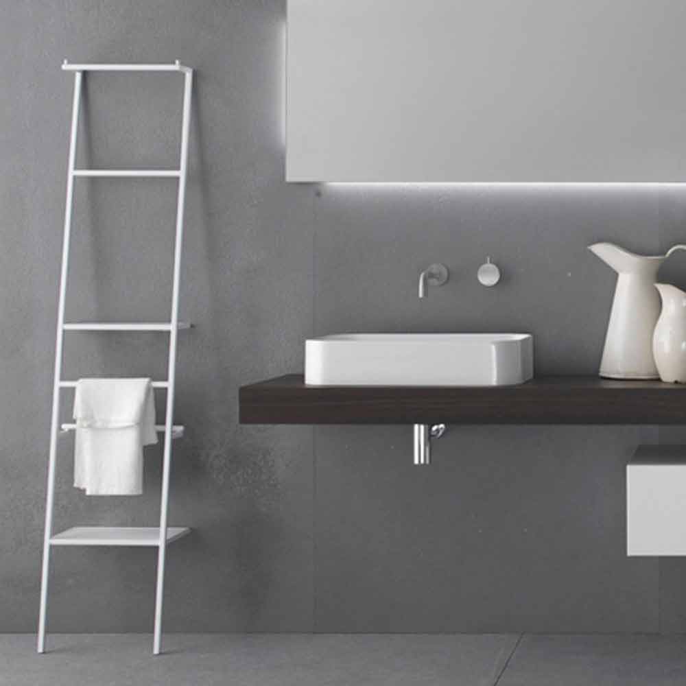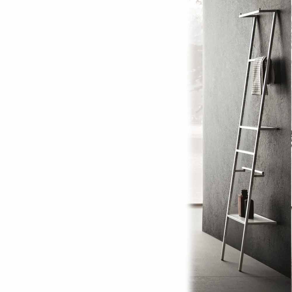 Hanging ladder in matt painted metal with a minimal and extremely functional design. It is equipped with shelves, hooks for bathrobes, roll bars and towel rails. Available in matt white or other matt colors.