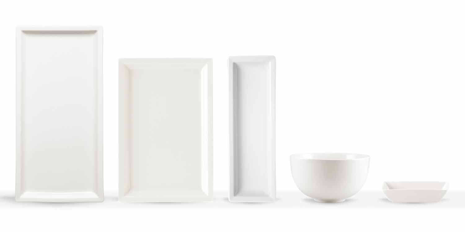 Dishes for the table with a modern design, in rectangular white porcelain, complete with 25 pieces.