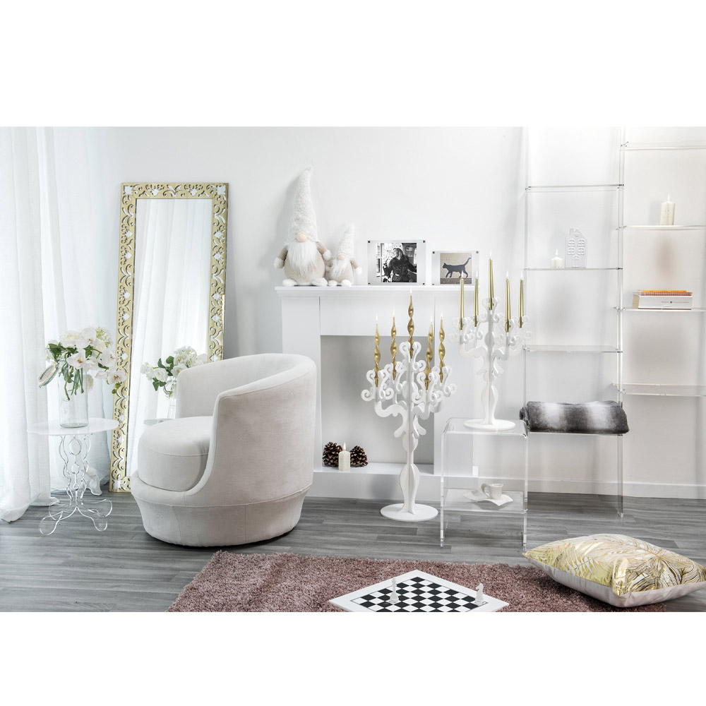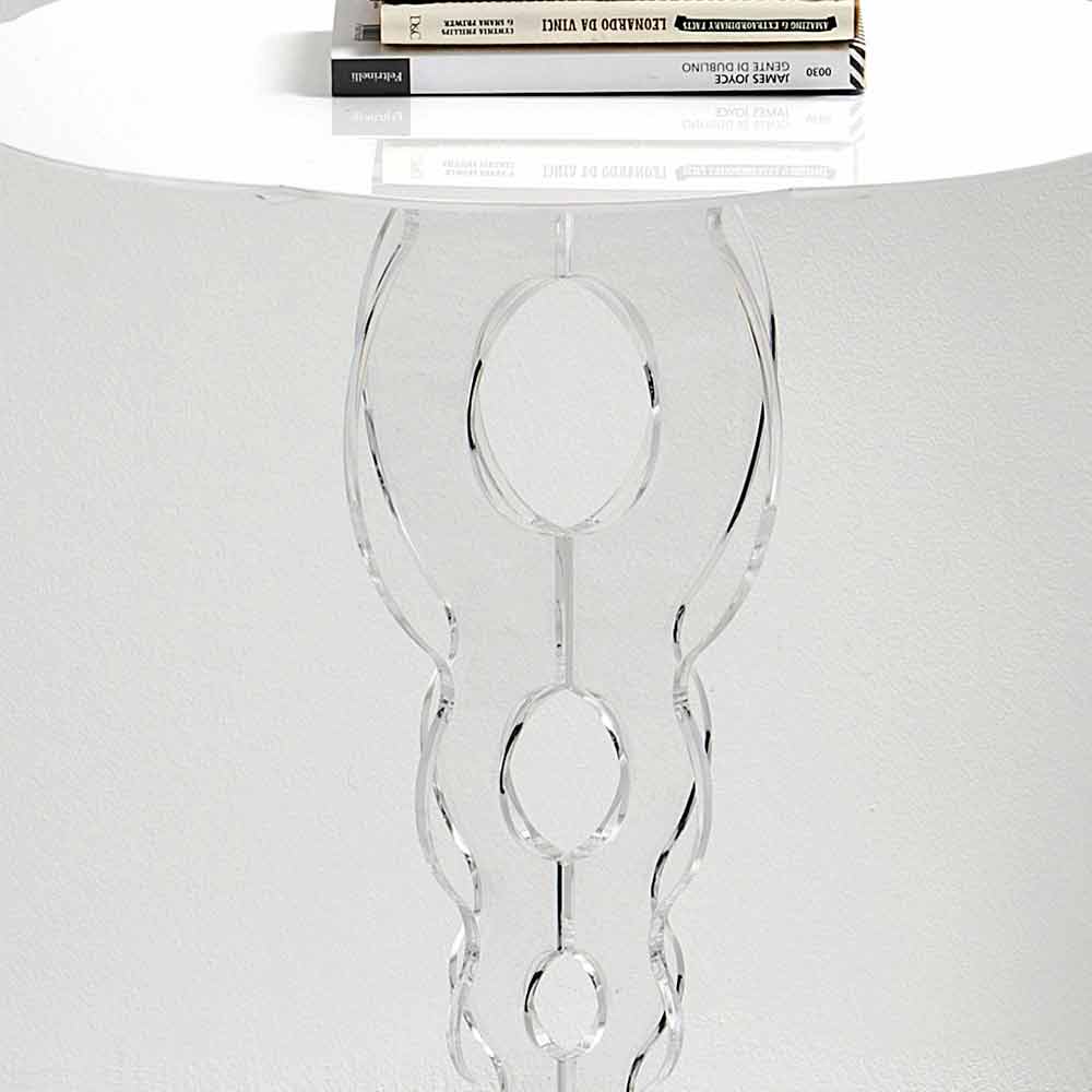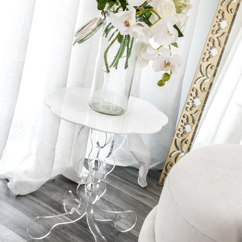 A moorish design characterises the Janis table, which can be used both as a coffee table or as a bedside table. The table base is made of laser-shaped 100% PMMA plexiglass. The table top gives a touch of color to the environment.