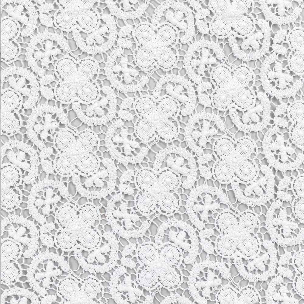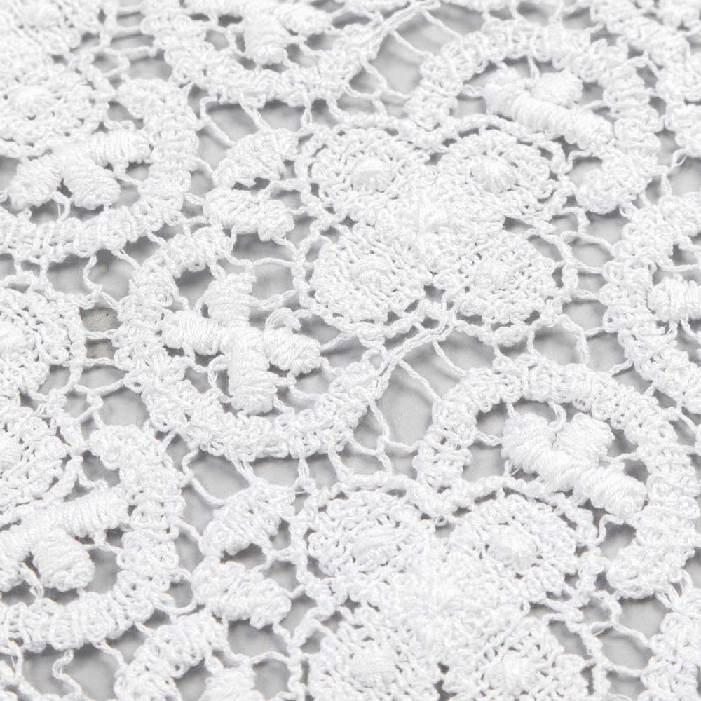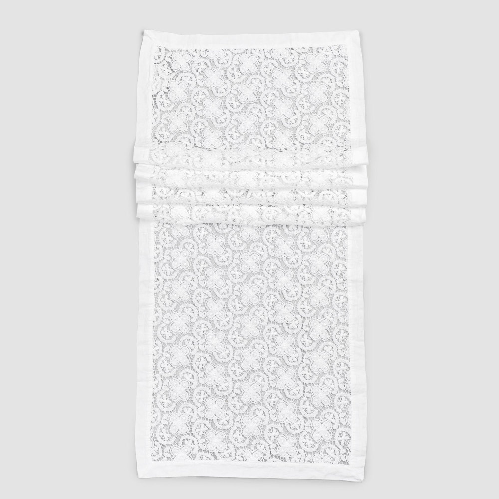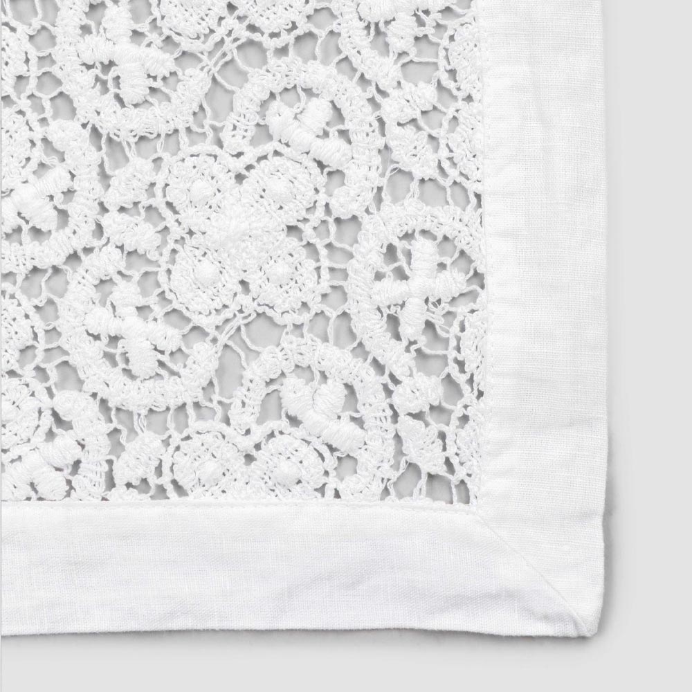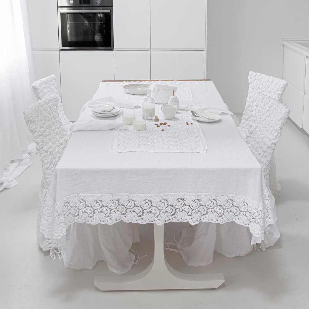 The white decoration runner is entirely embroidered in crochet lace and features a linen and cotton blend border with crease.