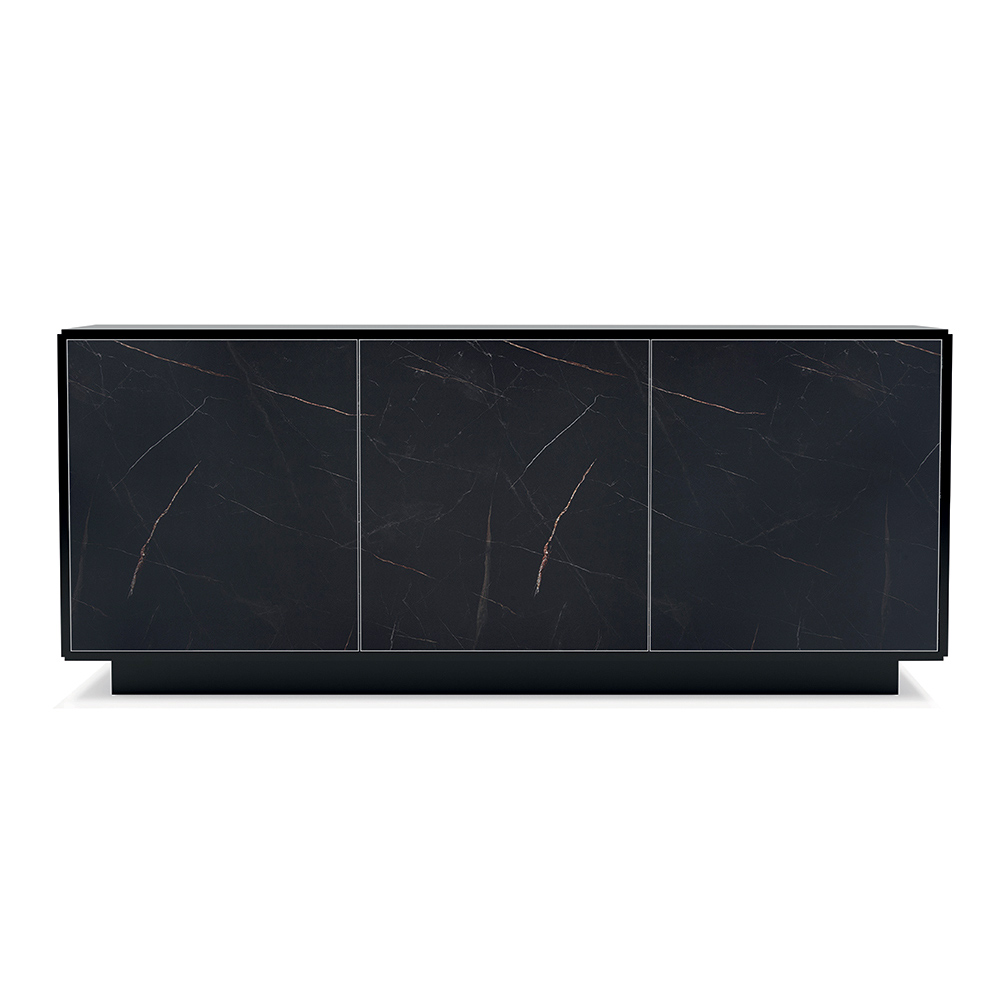Living room sideboard with structure and plinth base in matt lacquered wood , 2 or 3 doors with aluminum profile and fronts in marble effect HPL laminate equipped with push & pull opening system and internal shelves in transparent tempered glass (thickness 6 mm, maximum load 20 kg). A complement that comes from a 100% Made in Italy processing made through the use of high quality raw materials to give life to a product with a modern personality and a strong scenographic impact, ideal for those who love a sophisticated and avant-garde style of furniture . To underline even more the value is the HPL top, a high pressure laminate extremely resistant to chemical agents, abrasions and scratches which allows to offer a solid support surface with excellent durability .