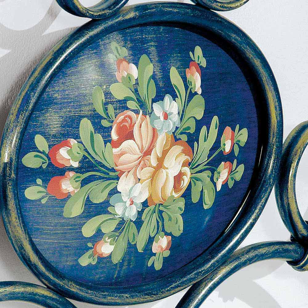 This bed is handmade in Italy by expert crafstmen and it has a light blue- gold finish.